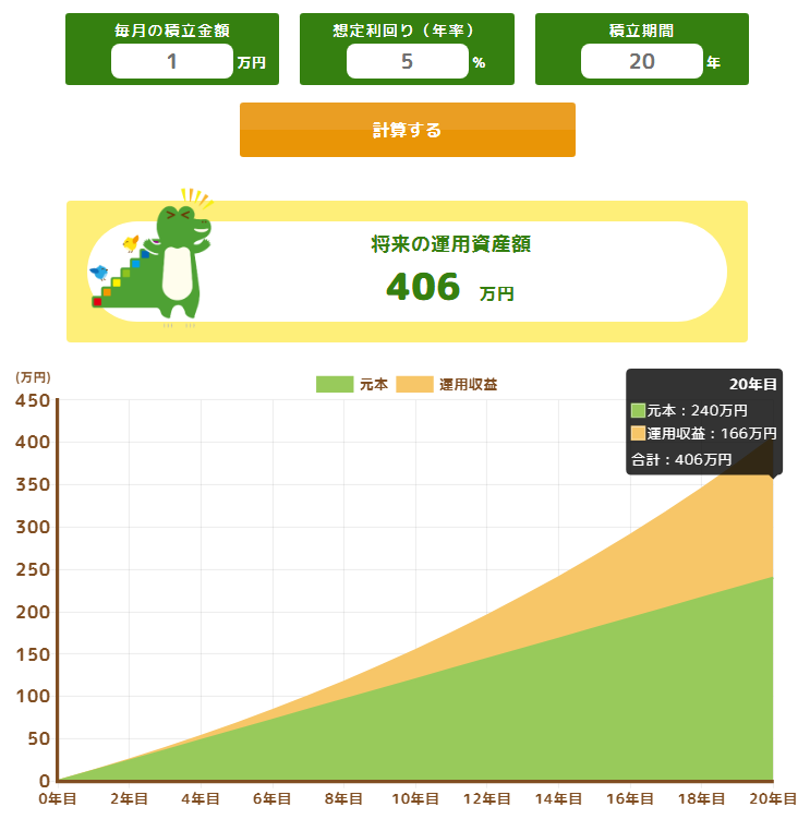 仮に毎月1万円を年利5%で20年間運用した場合、元本240万円に対して約410万円程度になる可能性があります。